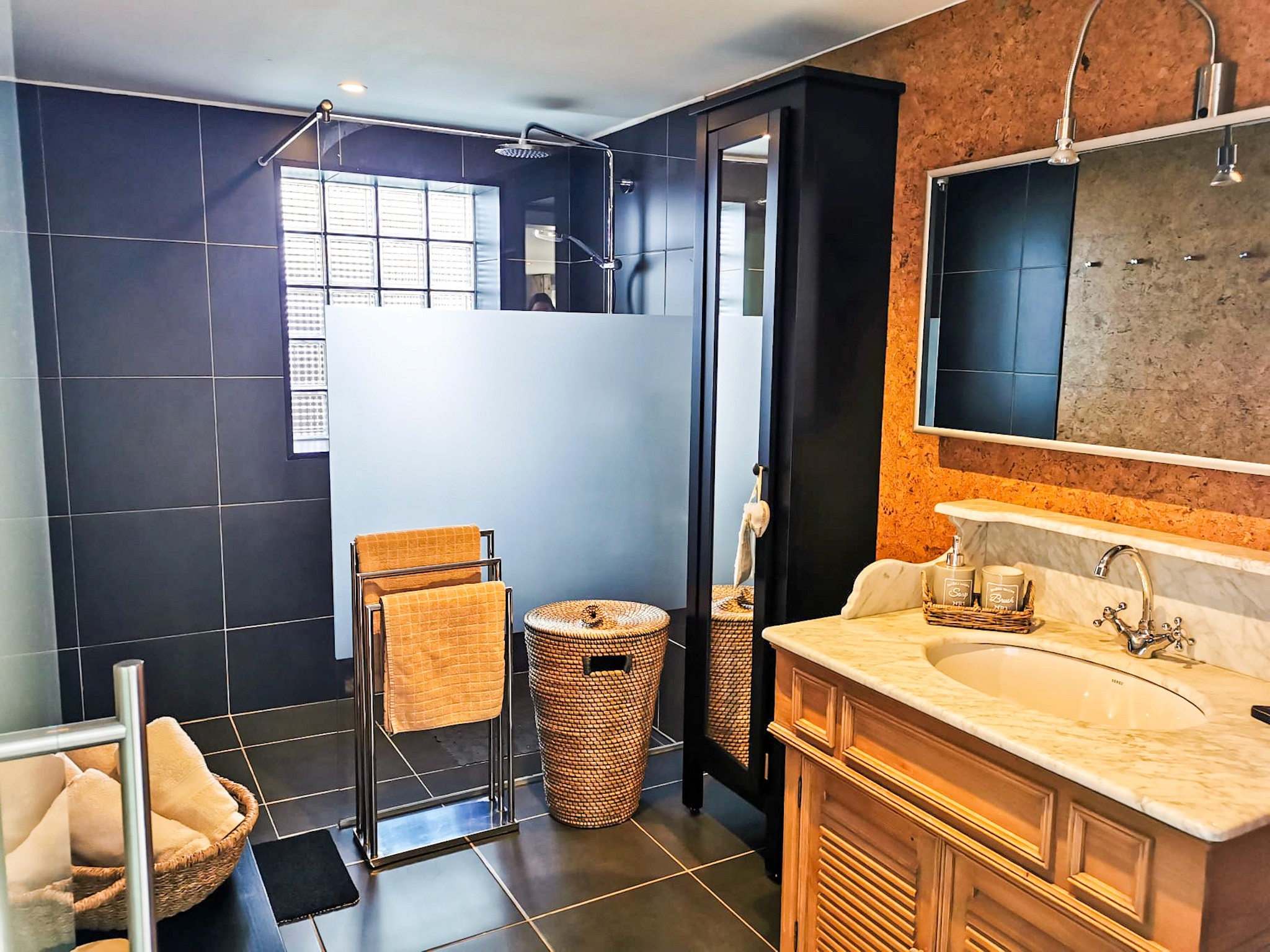 In de badkamer is er een moderne inloopdouche, een wastafel, een spiegel met ingebouwde infraroodverwarming. Handdoeken zijn aanwezig.